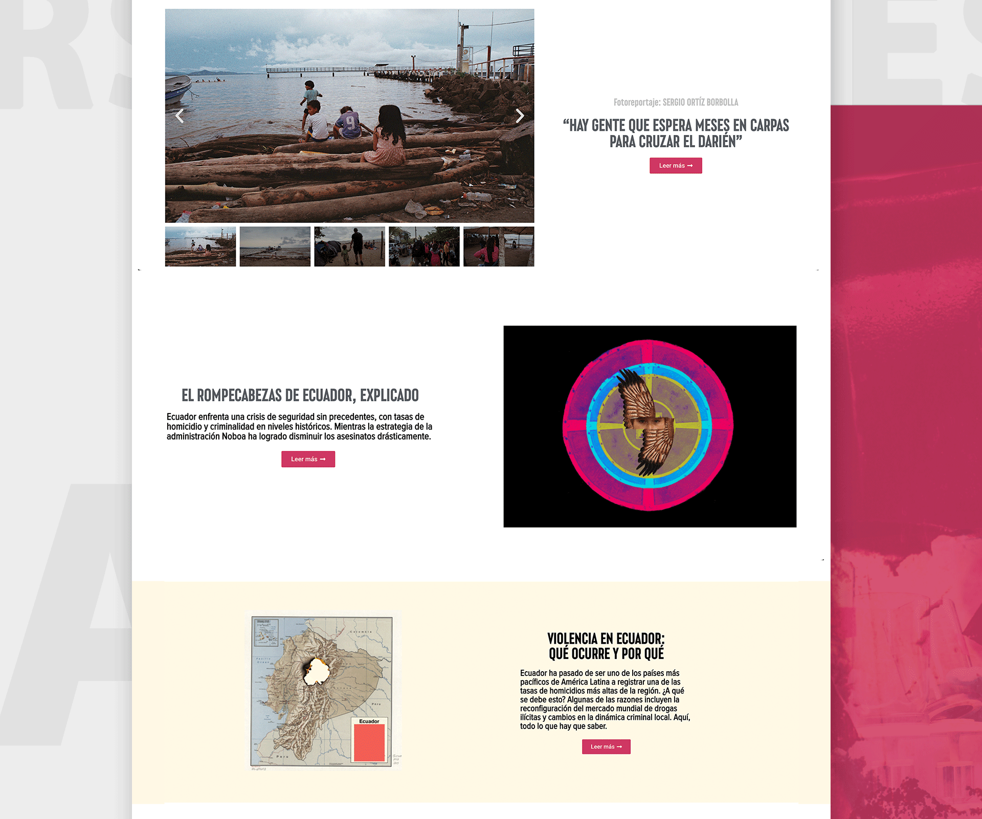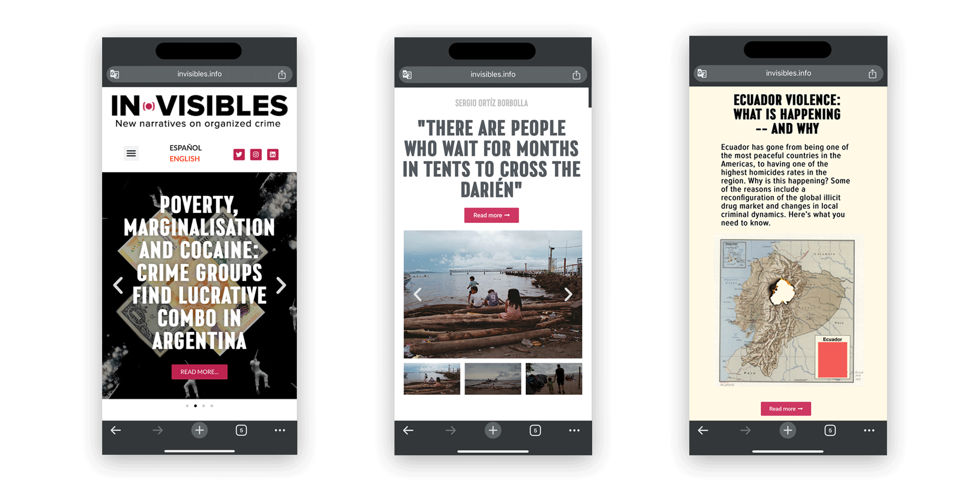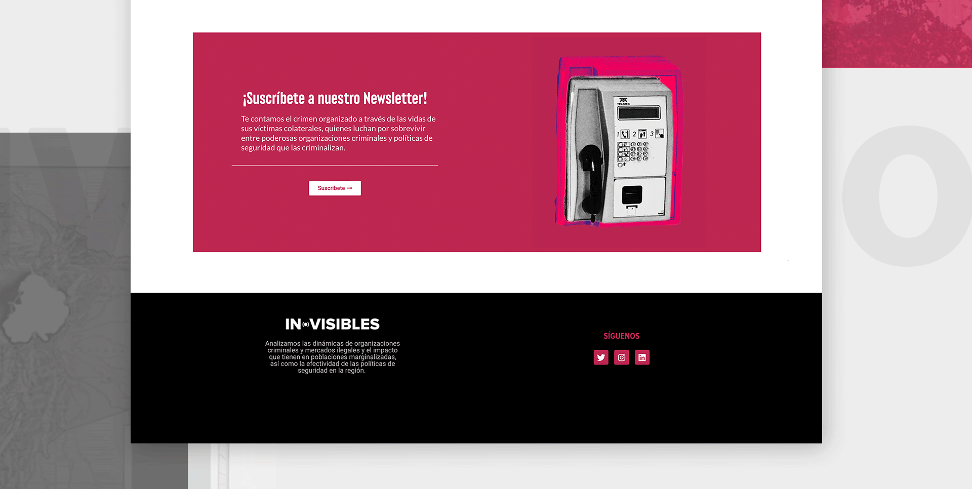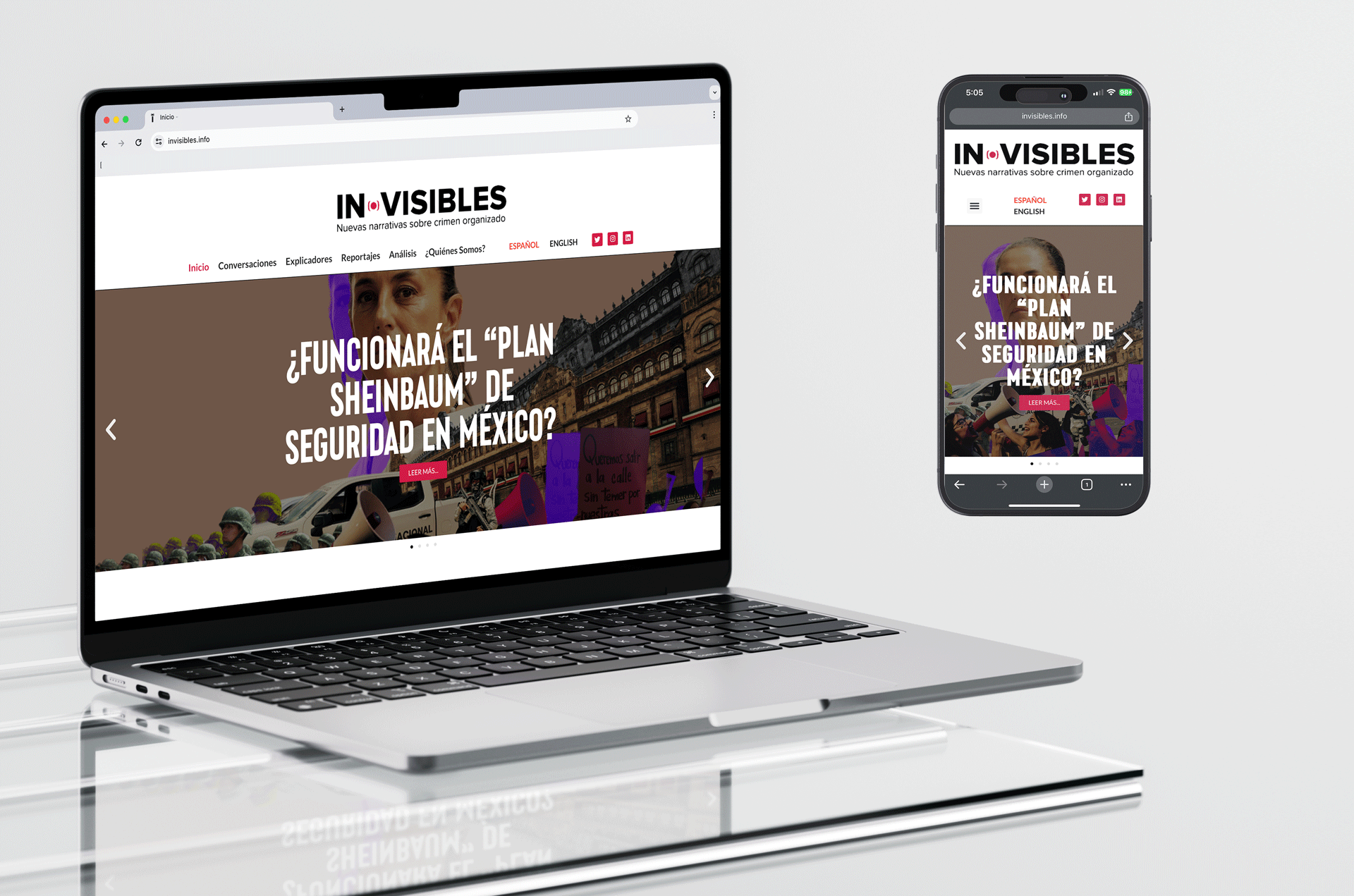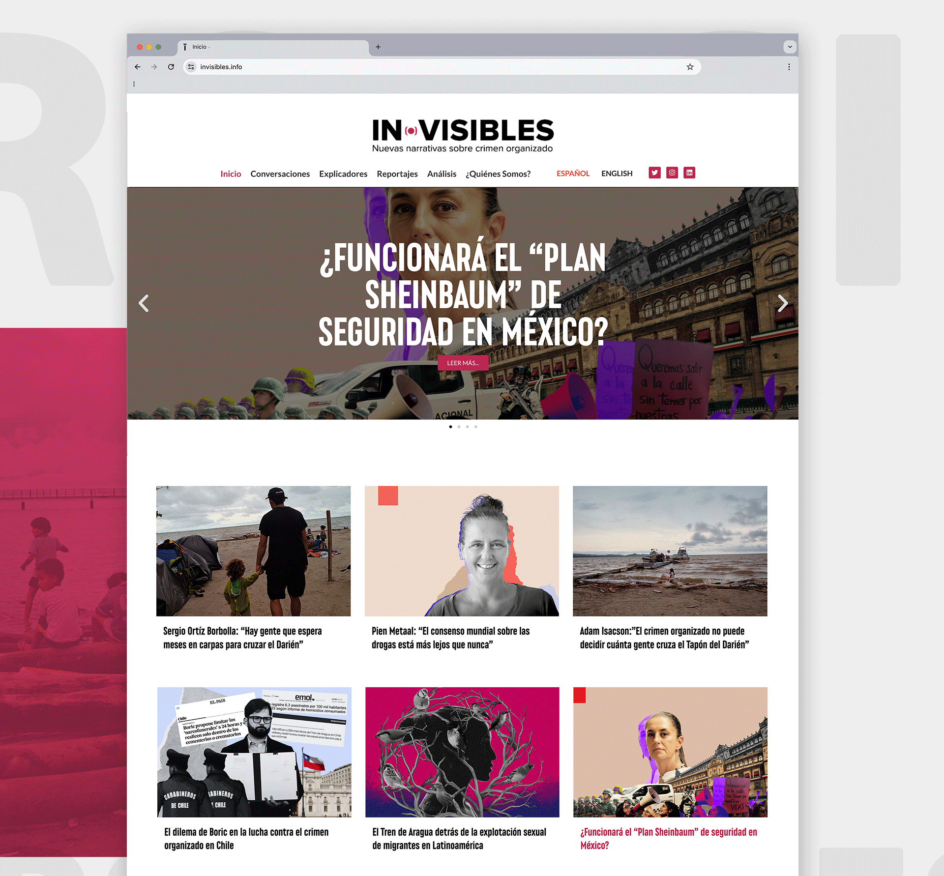 Diseño y desarrollo completo del sitio web para Invisibles, una organización conformada por investigadores, periodistas y comunicadores que documentan y analizan el crimen organizado en América Latina. El sitio está pensado para facilitar la lectura de investigaciones profundas, con una estructura clara, diseño sobrio y navegación optimizada para todo tipo de dispositivos. empleando una estructura modular que facilita su mantenimiento y escalabilidad. Se implementó un sistema de diseño responsivo que asegura una experiencia de navegación fluida en móviles, tabletas y escritorio. El diseño apuesta por una interfaz sobria, tipografía clara y jerarquías visuales bien definidas que priorizan la lectura y la navegación por regiones y temas clave.