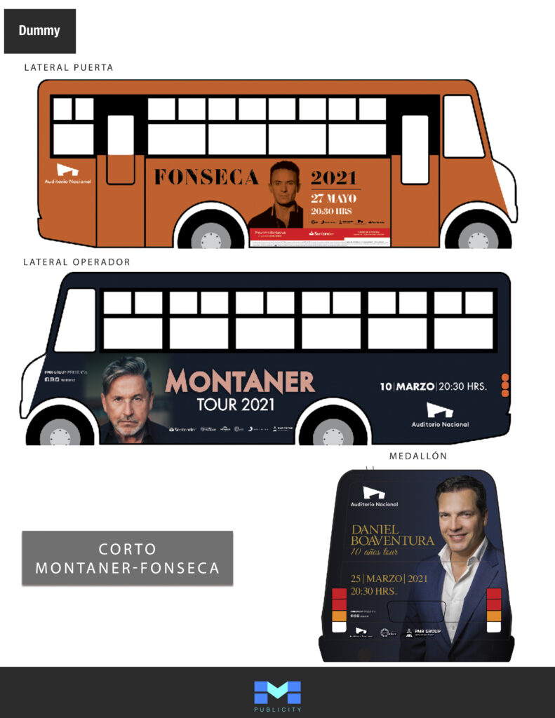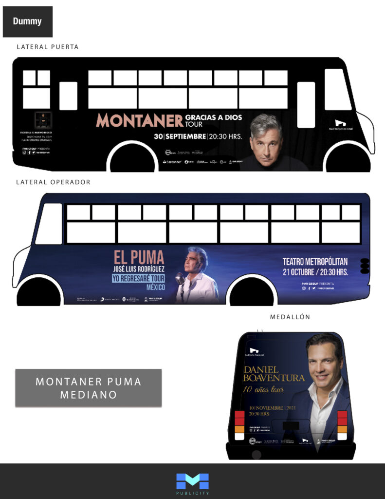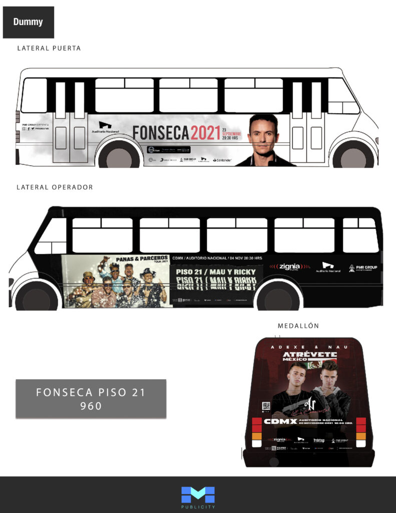 PMR Group es una agencia dedicada a la organización de eventos musicales y conciertos, para los cuales se diseñaron varias campañas publicitarias en autobuses urbanos en la Ciudad de México. El objetivo de estas campañas era incrementar la visibilidad de sus eventos y capturar la atención del público con diseños creados para resaltar la energía y la calidad de los conciertos organizados por PMR Group. El uso estratégico de espacios en el exterior de los autobuses permitió una exposición constante y repetitiva, reforzando el reconocimiento de la marca y manteniendo la información de los eventos presente en la mente del público.